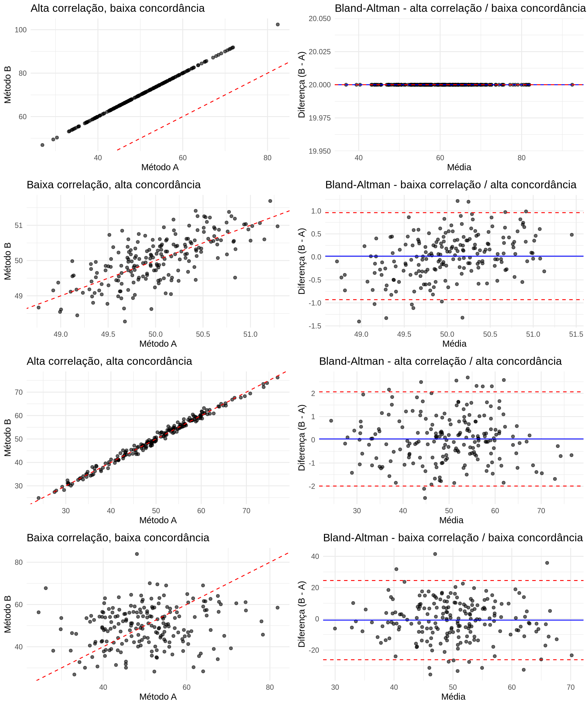 #| fig-cap: "Correlação e concordância em quatro cenários simulados."